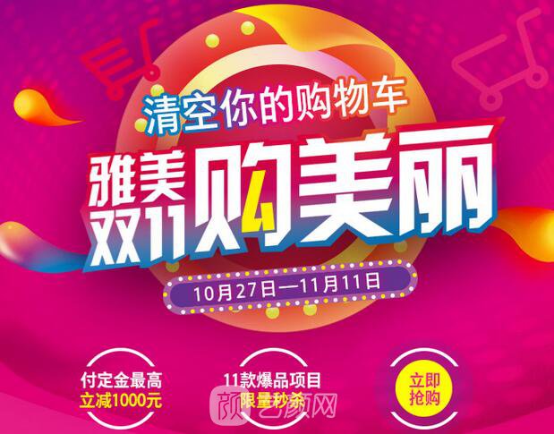 長沙雅美醫(yī)療美容醫(yī)院——雅美·雙11購美麗,隆重推出“清空你的購物車”活動~一年僅一次 寵你沒商量,付定金立減1000元,11款爆品項目限量優(yōu)惠力度大,人氣變美項目來就送,你購物我買單,充值雙倍 美麗翻倍,上門禮、消費禮、大咖禮專屬于你。